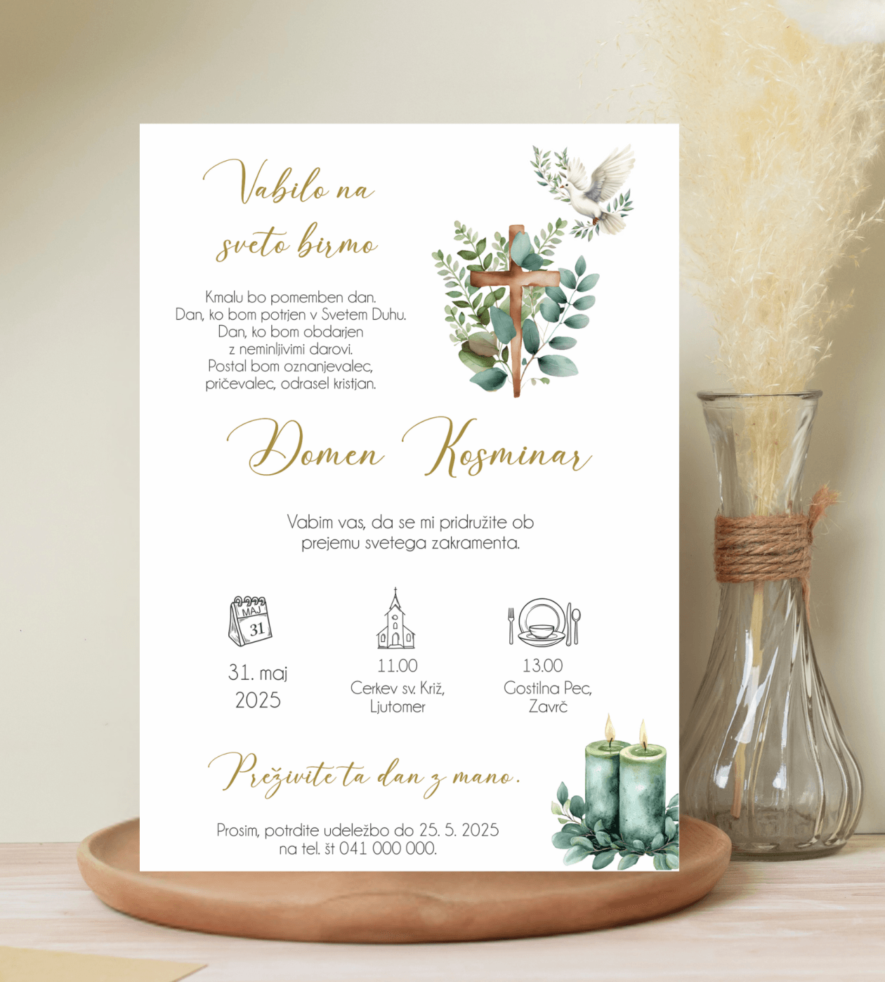 Vabilo za birmo z nežno simboliko in premišljenim dizajnom je lepo povabilo, s katerim boste svoje najbližje povabili k praznovanju tega posebnega dne. To vabilo za birmo z zelenjem, golobčkom, križcem in svečami je vabilo, ki ga povabljeni ne bodo nikoli pozabili.