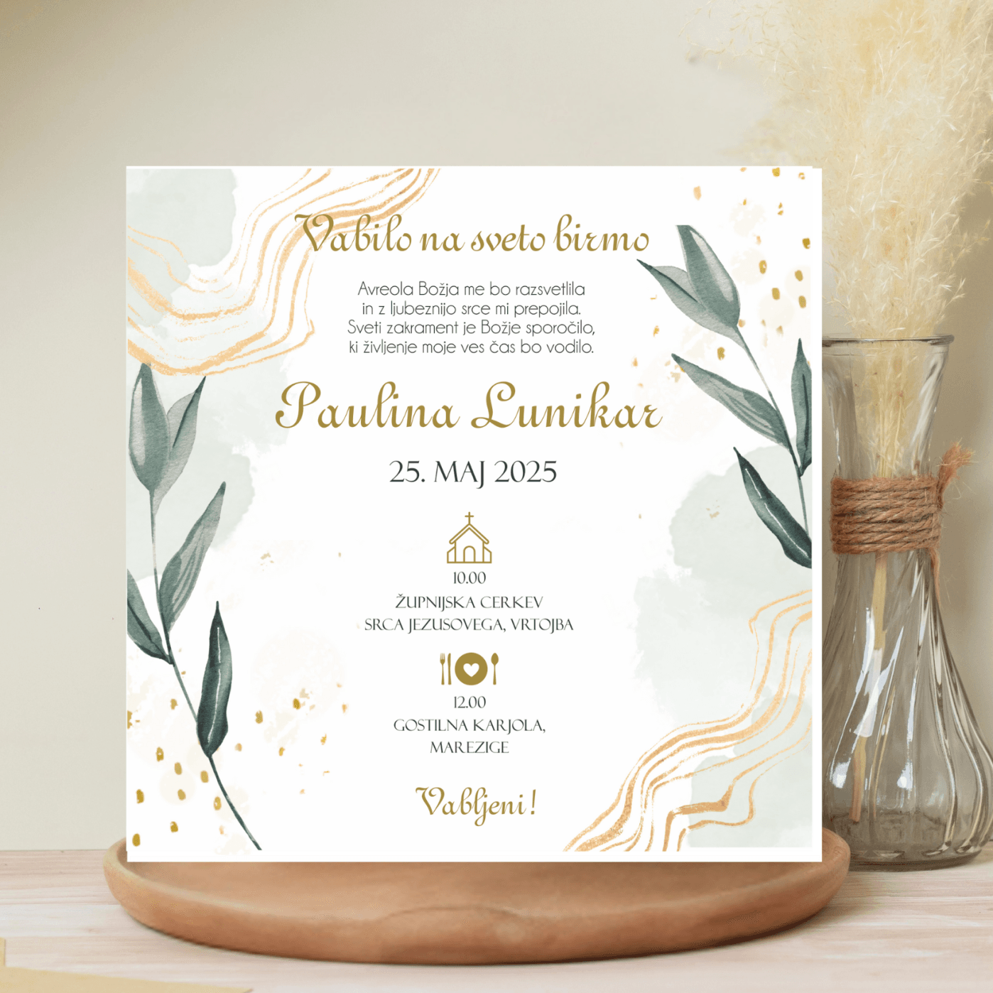 Vabilo za birmo z nežno simboliko in premišljenim dizajnom je lepo povabilo, s katerim boste svoje najbližje povabili k praznovanju tega posebnega dne.