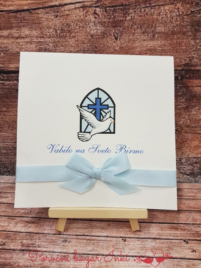 Vabilo za birmo je narejeno iz belega 290g perl papirja. Ima birmanski motiv in minimalistično obliko besedila. Vabilo ima nežen birmanski motiv , golobčka, križca in svetlo modro pentljico. Dimenzija vabila je cca 12×17.