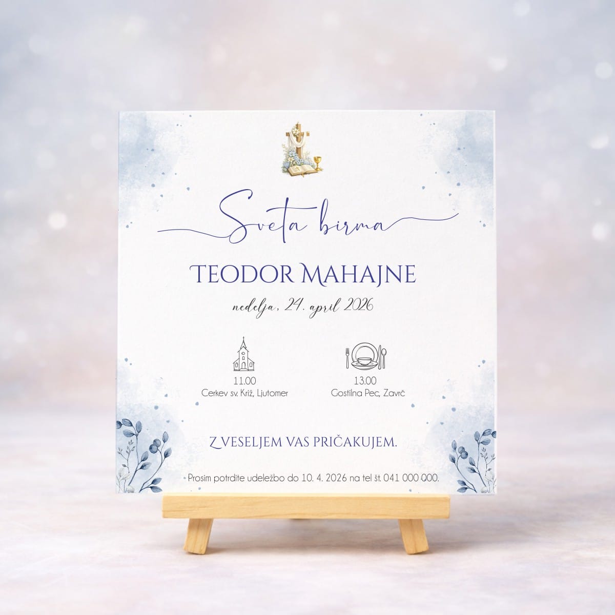 Vabila za birmo imajo posebno vlogo, saj na lep in spoštljiv način najavijo pomemben verski dogodek v življenju mladega birmanca ali birmanke. Z njimi povabite družino, botre in prijatelje ter jim sporočite veselje in pomen tega dne. V naši ponudbi najdete unikatna vabila za birmo, ki jih lahko popolnoma prilagodimo vašim željam.