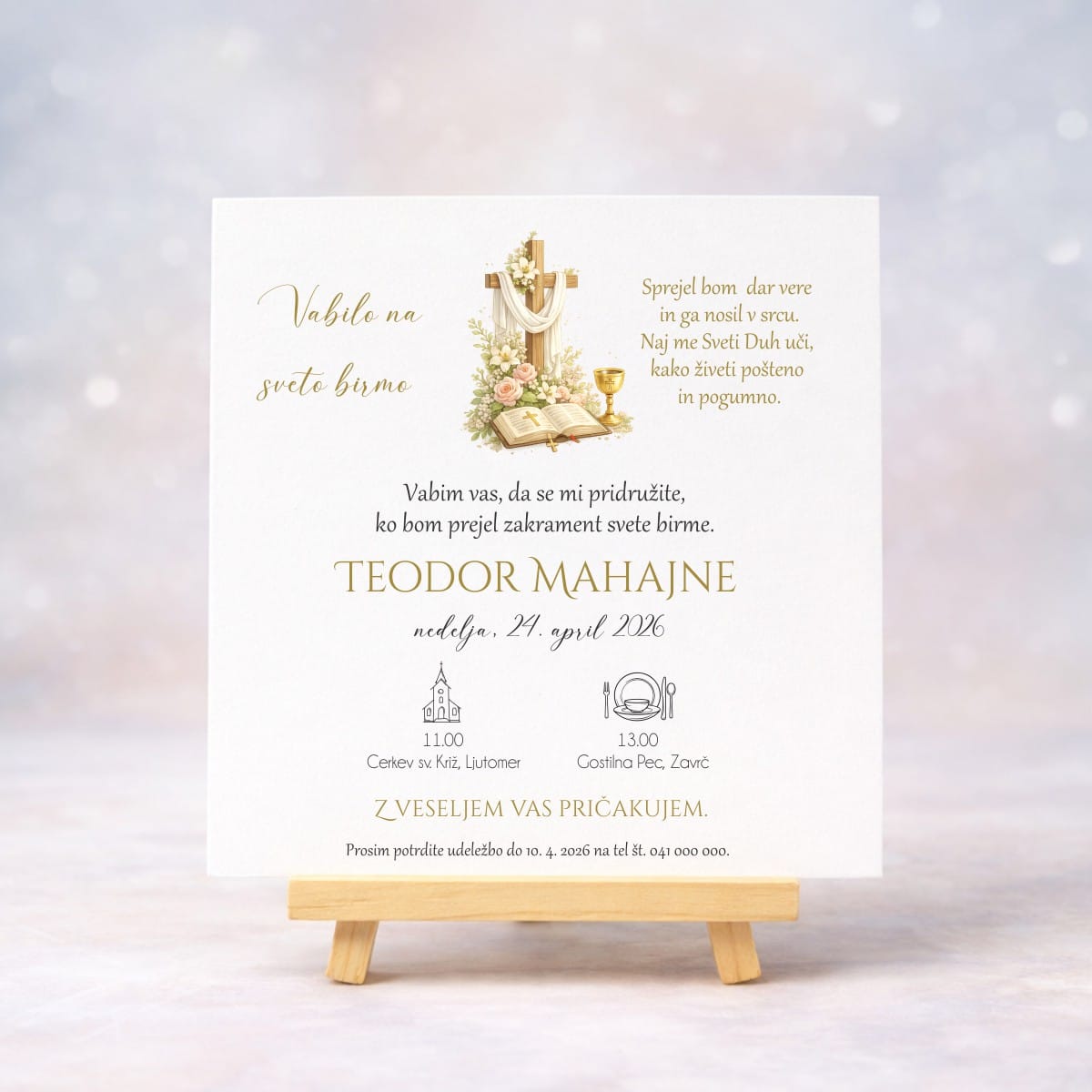 Vabilo za birmo z nežno simboliko in premišljenim dizajnom je lepo povabilo, s katerim boste svoje najbližje povabili k praznovanju tega posebnega dne.