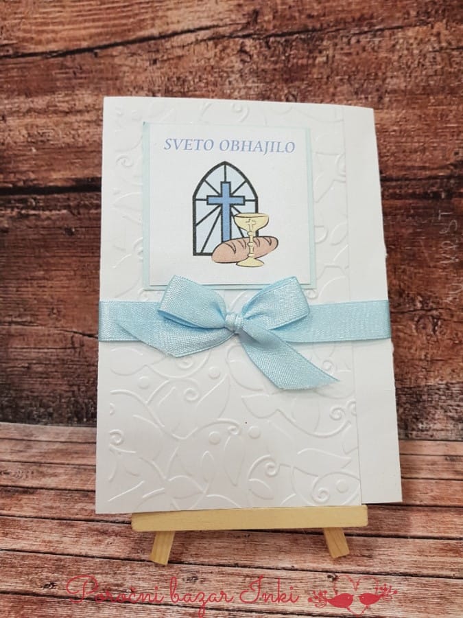 Vabilo za obhajilo s potiskanim papirjem, modro pentljo, križcem in kelihom Vabilo za obhajilo s potiskani...