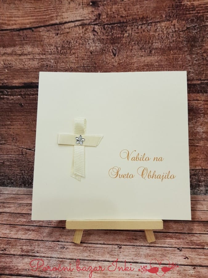 Vabilo za obhajilo z belim križcem in zlato pisavo Vabilo za obhajilo z belim kri...