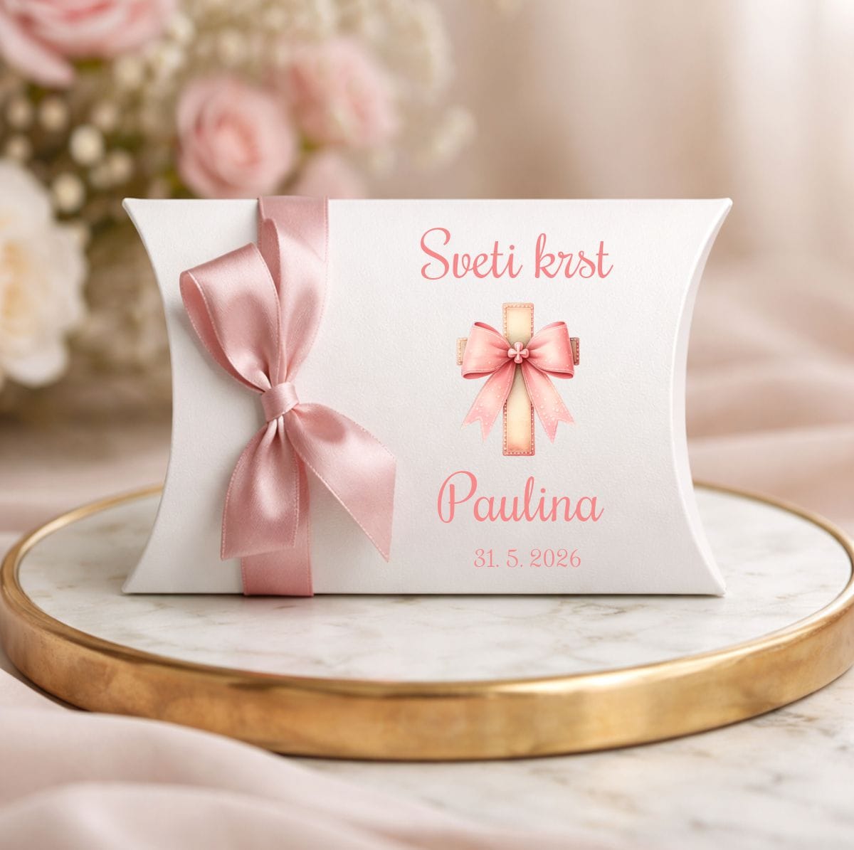 Personalizirane zahvalne škatlice za krst so izdelane iz belega perl papirja, velikosti približno 10 × 8 cm,